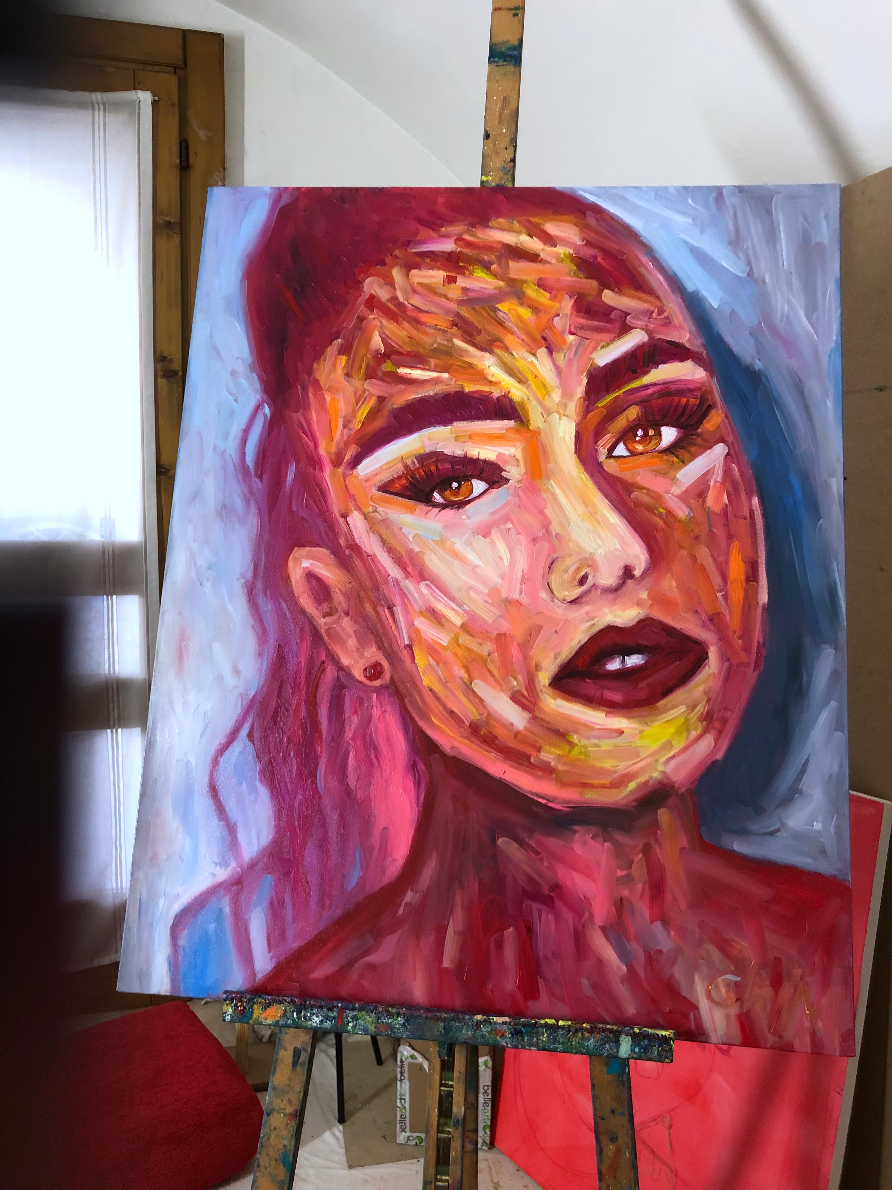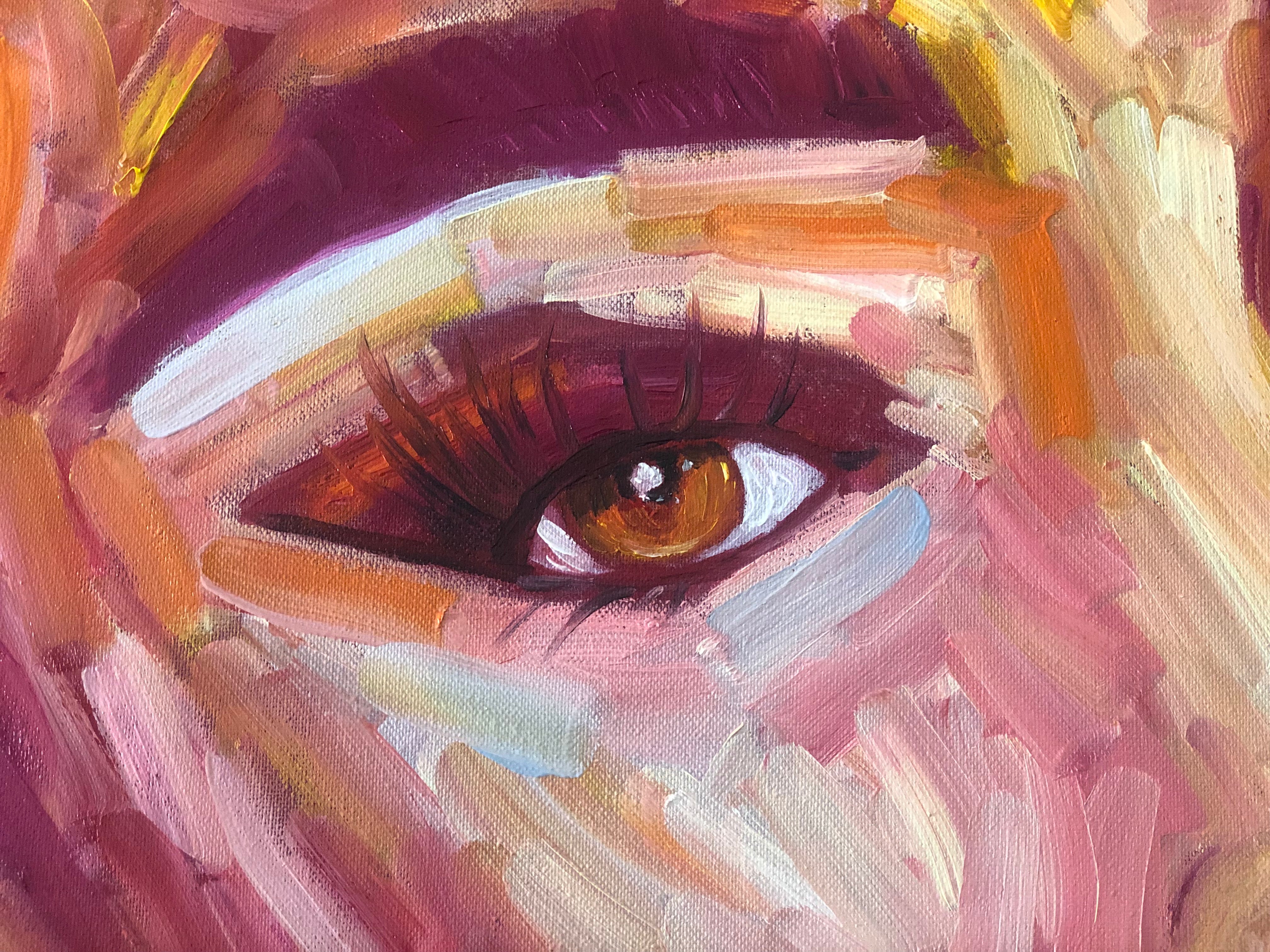Her gaze is magnetic—both distant and intimate, as if she’s in her own world but aware that you’re watching. Her skin glows in flaming oranges, pinks, and reds, like she’s lit from within. And the texture? It’s alive. The oil paint dances in thick, impulsive strokes that bring the face to life with movement and emotion.