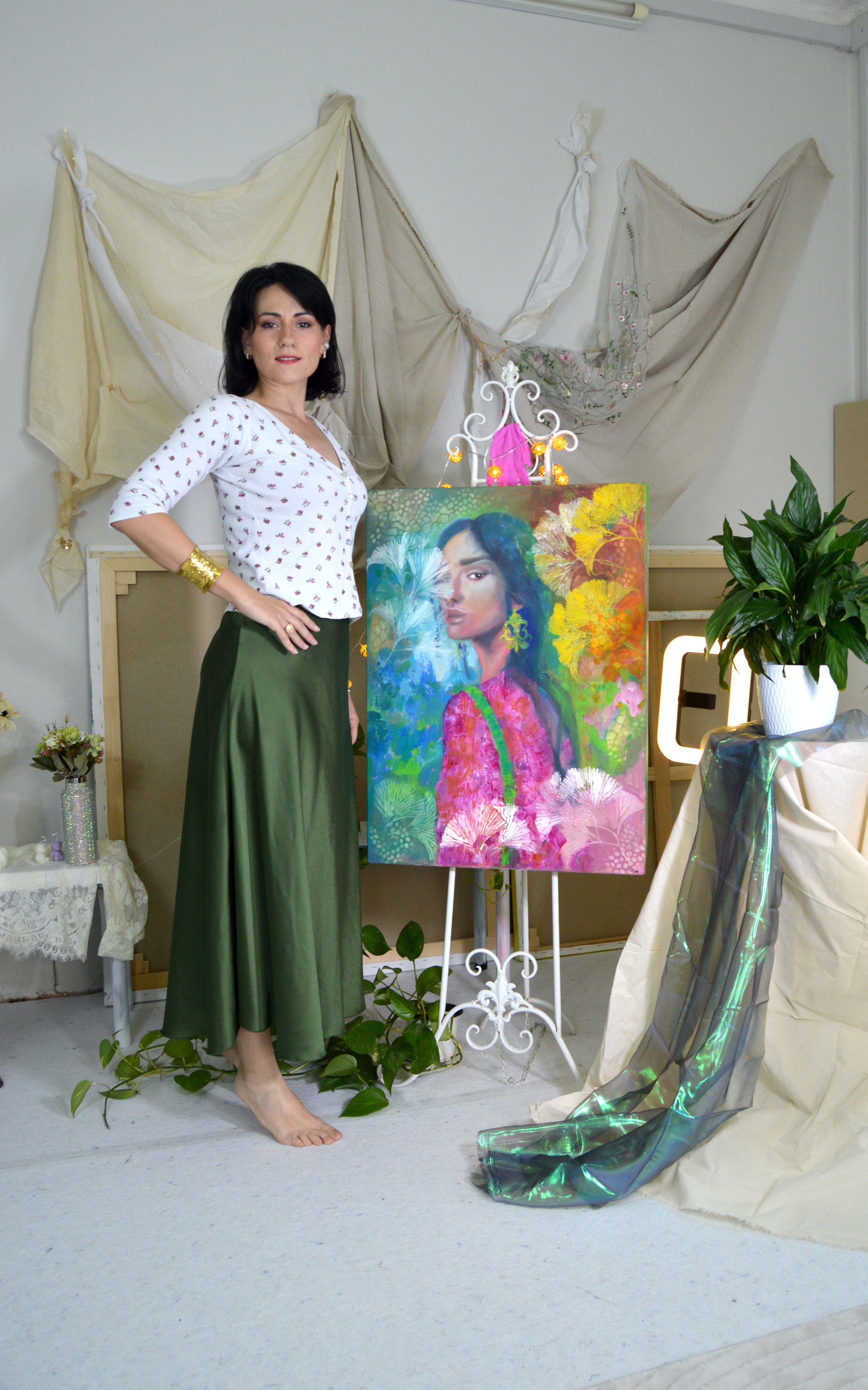 I painted her with vibrant contrast, electric pinks and greens, bold yellows and delicate whites, because the inner world is never grey. It's loud. It’s chaotic and beautiful and full of life.