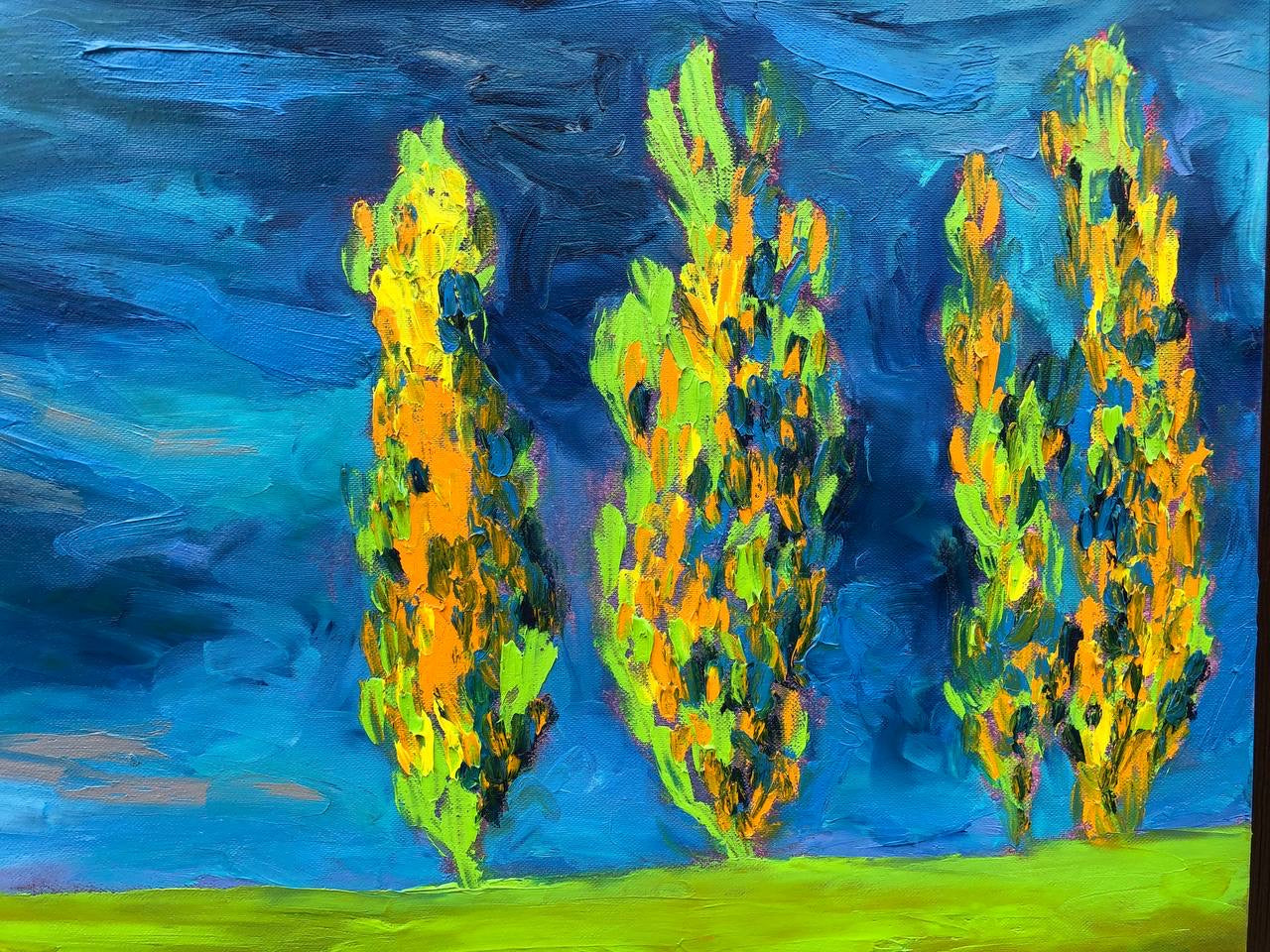 Under a vast, swirling sky, where the wind moves freely and the air is crisp and invigorating, three vibrant trees stand tall. They sway gently, their golden leaves flickering against the backdrop of an ever-changing sky. The contrast between the stormy blues above and the rich greens and yellows below draws you in, making you feel as though you are standing in that very field, breathing in the “Fresh Air” of a world untouched by chaos, where nature reigns in perfect harmony.