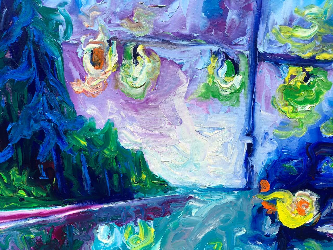 This painting is all about motion and atmosphere. Thick brushstrokes and a saturated palette bring the scene to life with raw energy. Blues, greens, and purples melt together on the glistening asphalt, while yellow and orange lights break through the cold with a touch of warmth—like hope on a cloudy day.