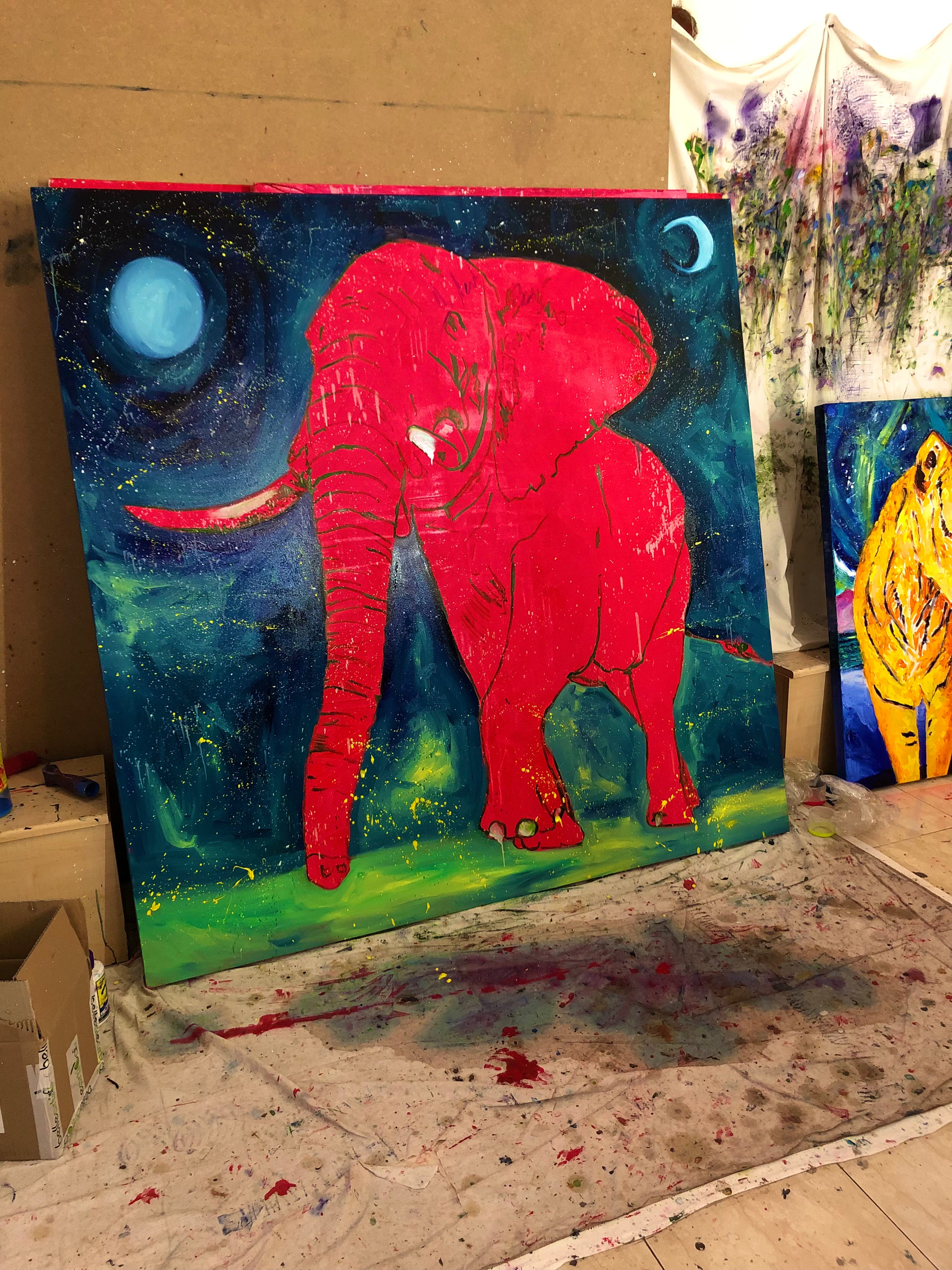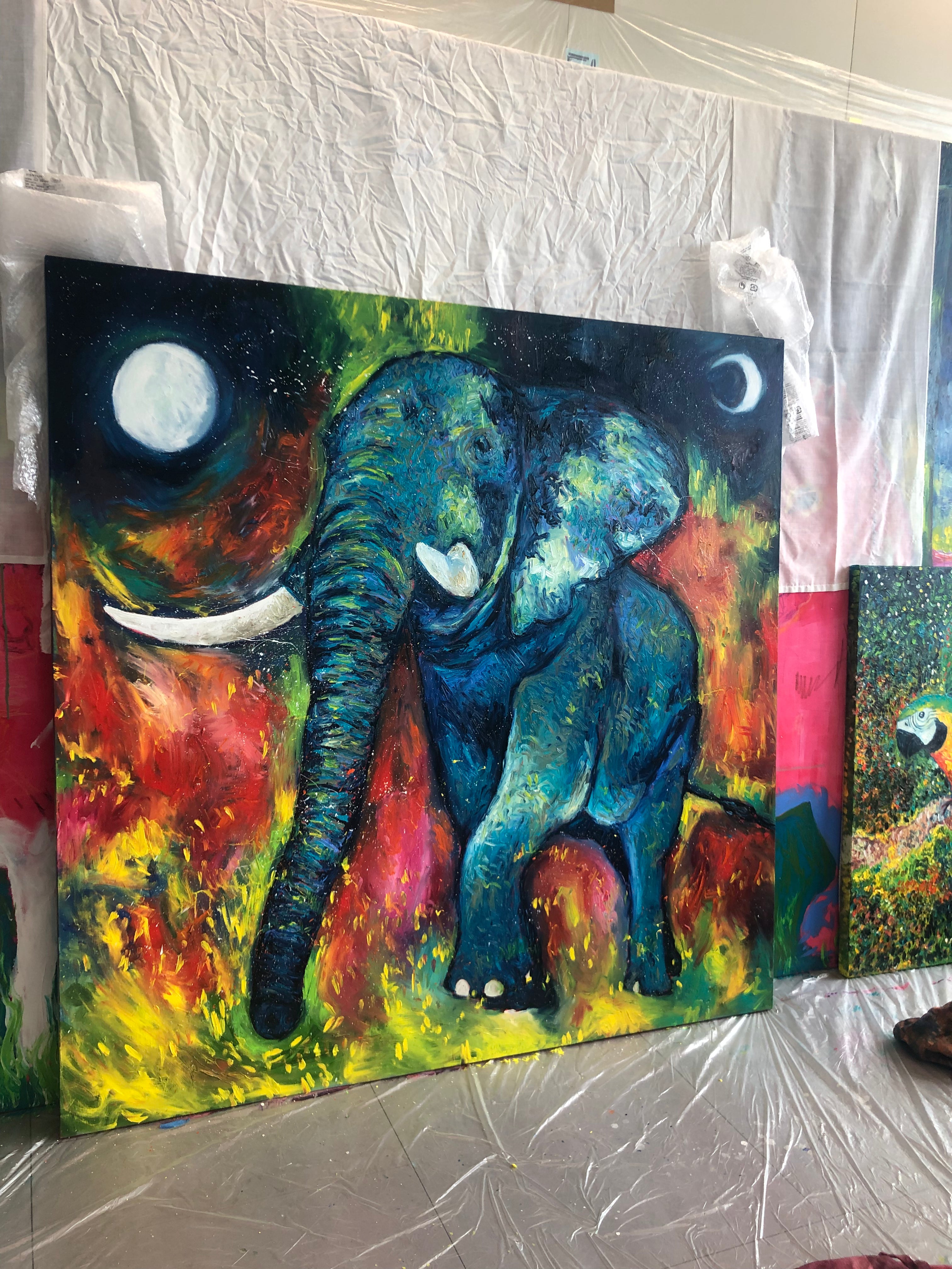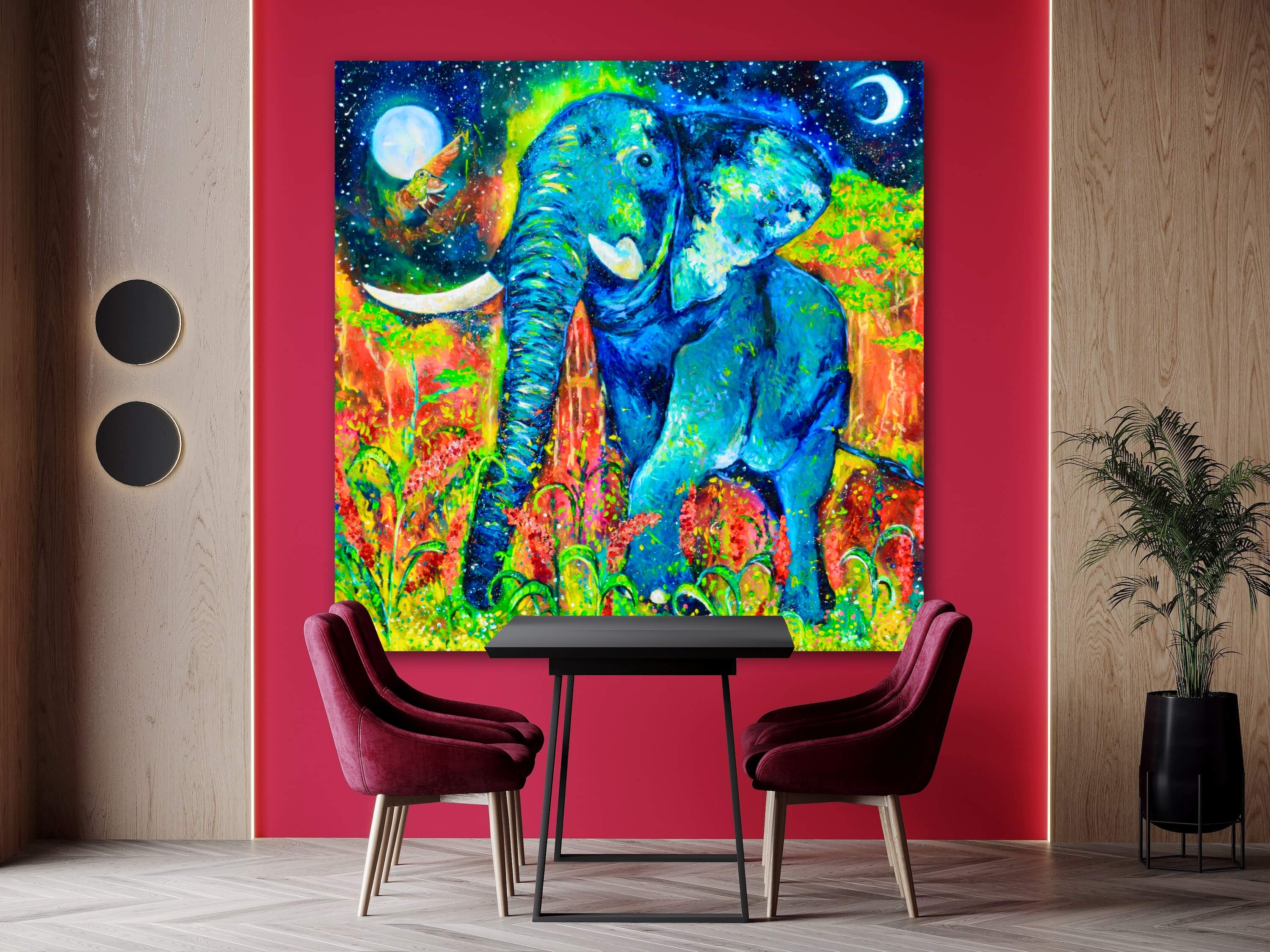Commission a Similar PieceOriginal painting made with oil on canvas, the paint was applied to the canvas using only the fingers, the work is in the painting style called Bright Expressionism. The name Kamali is of Arabic origin and means “guide spirit”, “protector”. This painting portrays the elephant as a strong yet gentle animal, capable of balancing its power with the lightness and delicacy of the flowers surrounding it. The elephant is depicted walking through a field of flowers, accompanied by the flight of a hummingbird that is completely at ease in the presence of the large animal. The elephant is majestic and imposing, yet at the same time delicate and respectful of nature. The flowers surrounding it symbolize the kindness and beauty of life, while the hummingbird represents the delicacy and lightness of existence. The starry sky, with two moons, creates a surreal and dreamy atmosphere, making us think we are on another planet or in another solar system. The strong light and energy illuminating the elephant's body and head symbolize the strength and power of kindness and delicacy. Just as its name suggests, this creature emanates the energy of a guiding spirit ready to protect us on our journey.
